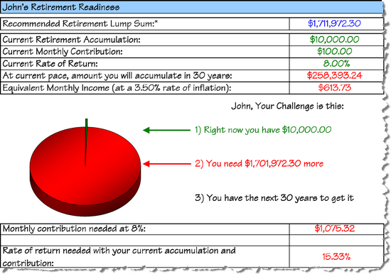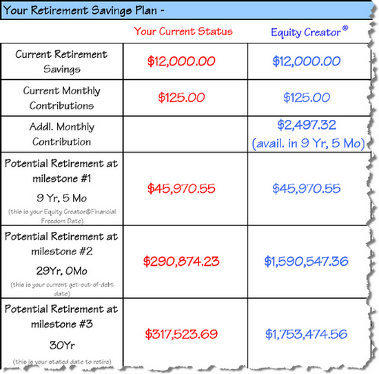 In the back of your personalized Equity Creator® Financial Blueprint you will find the Program Summary Page. The Red column will represent your current financial situation and the Blue column shows what will happen if you follow your Blueprint through to completion. The sample chart to the right is the bottom half of the chart which covers your Retirement Savings. Notice in this example that you are debt free (including your mortgage) in 9 years and 5 months. At this time you would redirect your monthly debt money into your retirement account. At Milestone #2 in the chart, which represents when you would have originally paid off your debts, notice the difference from the